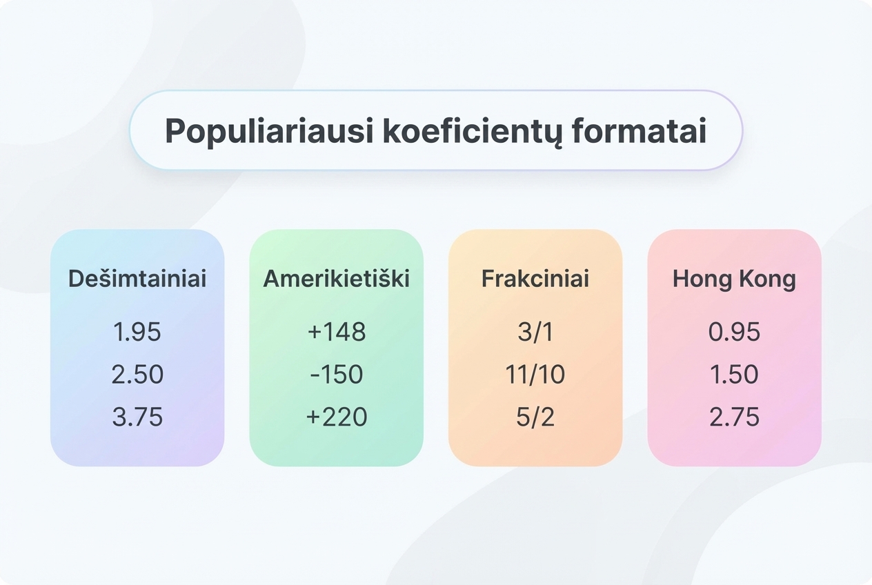 Lietuviškos lažybų bendrovės dažniausiai naudoja dešimtainių koeficientų formatą. Pavyzdžiui, 2.00 reiškia, kad statant 10 € atgausite 20 € – į šią sumą jau įskaičiuotas ir pradinis statymas. Skaičiavimas paprastas: statymo suma dauginama iš koeficiento.